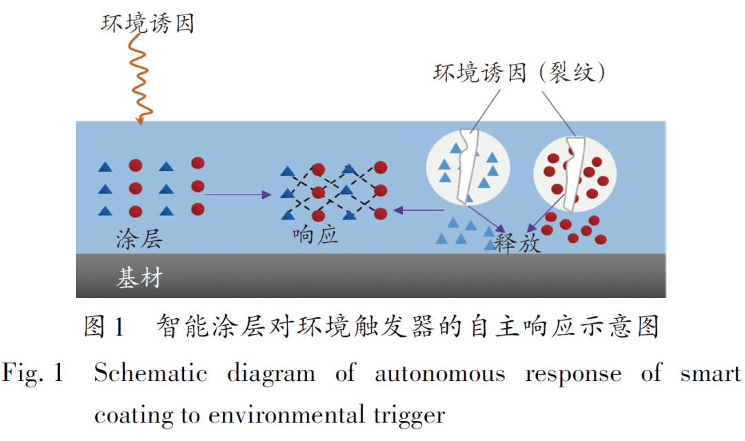图1所示为智能涂层对环境触发器的自主响应机理示意图。当特定的外界环境触发发生,涂层中的部分物质/聚合物就可以自发进行某些响应,如光聚合反应、固化交联反应等;或者机械损伤导致聚合物微胶囊/纳米容器中的功能粒子释放,二者即刻发生响应,如功能粒子为树脂、固化剂或者缓蚀剂等微粒,因机械损伤释放后可以主动进行固化反应或缓释反应,从而对外界触发作出响应。