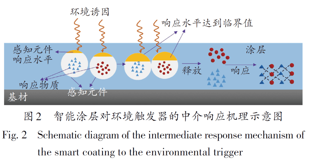 不同于自主响应,中介响应机理是外界刺激信号(触发器)通过涂层感知元件(中间媒介)传递给响应元件,当局部区域的感知元件接收到外界刺激且这种刺激达到临界水平时,感知元件自身发生一定的改变,释放响应元件或将信号传递给响应元件,然后进行响应。中介响应机理包含触发因素、感知元件、响应元件3大要素,其响应机理示意图见图2。相比于自主响应机制,针对不同环境下的中介响应机理给科研人员许多创新空间,如pH响应、氧化还原响应、光照响应、电磁响应等。