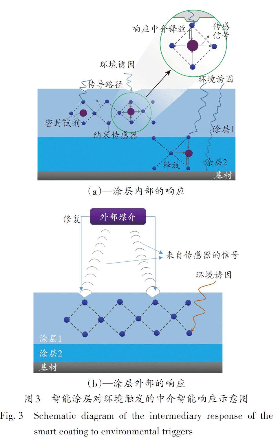 图3 为中介智能响应机理示意图。在图3(a)中,信号通过涂层中的缺陷穿透涂层到达感知元件,当局部区域的纳米传感器检测到触发因素时,它们可以将信号传递给驱动剂,然后驱动响应。图3(b)表示响应发生在涂层外部时的情况,当感知元件检测到触发因素时,它们会向外部设备发出信号,然后促进外部进行响应。