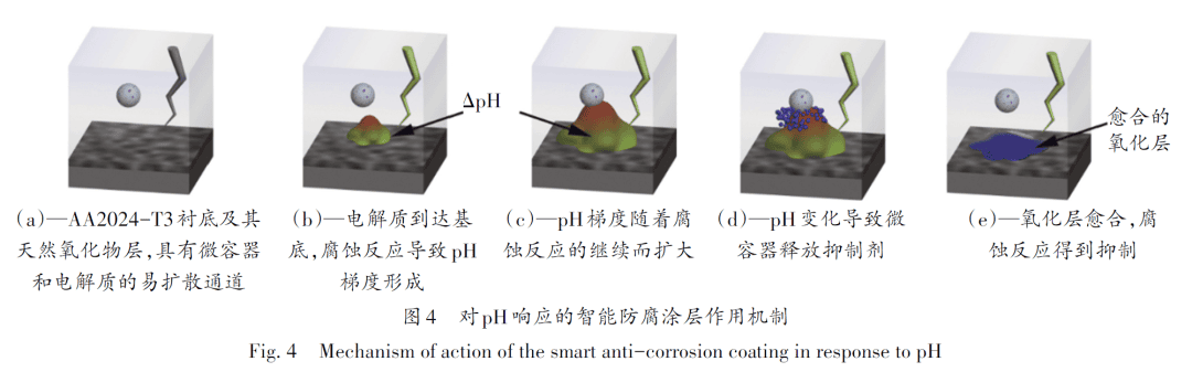 Soleymanibrojeni等以3-氨基?1,2,4-三唑?5-硫醇(ATAT)作为有机抑制剂,智能微容器为响应中介,开发出AA2024-T3智能防腐涂料,如图4所示。其中ATAT的传递通过负载ATAT的智能微容器来实现,该智能微容器可以对涂层-基质界面处的腐蚀反应引起的pH变化作出响应,当pH达到一定程度时释放腐蚀抑制剂ATAT,从而抑制腐蚀反应发生,获得主动防腐能力。