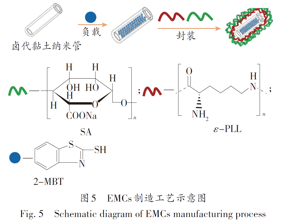 Li等设计了一种基于水性聚氨酯涂层的新型环境友好型腐蚀防护系统。该系统以2-巯基苯并噻唑(2-MBT)为抑制剂,卤代黏土纳米管(HNTs)为抑制剂载体,并以天然聚电解质ε -聚-L-赖氨酸(ε-PLL)和海藻酸钠(SA)作为逐层封装(LBL)聚电解质,制备了对水和pH(7~10)响应的智能微胶囊(EMCs)。其中2-MBT从EMCs中释放是一个对水和pH敏感的长期过程,且2-MBT的外释放速率同时受2-MBT和SA层的溶解度控制。研究发现2-MBT能够与腐蚀性介质一起转移到涂层/金属界面,并在阴极区域释放更多,具有出色的自修复性能。这种环保型聚氨酯不仅为水性聚氨酯涂料提供了理想的自我修复性能,而且为按需设计未来市场的聚氨酯提供了新思路。EMCs制造工艺如图5所示。