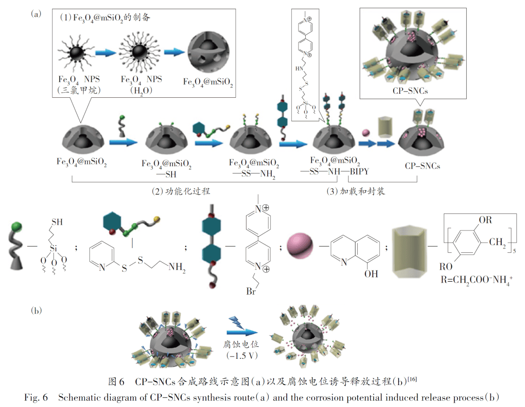 Ding等将超分子组装体联吡啶水溶性芳烃通过二硫键连接到磁性纳米载体(Fe3O4@mSiO2)的外表面,设计并合成了对腐蚀电位敏感的智能纳米容器(CP-SNCs),如图6(a)所示,然后将CP-SNCs加入有机-无机杂化溶胶-凝胶涂层中,构建腐蚀电位刺激响应防腐涂层(CP-SFAC)。在磁场作用下,CP-SNCs聚集在镁合金AZ31B表面附近并沉积,形成具有高结合力的超分子组装体,有效地阻止了包裹在Fe3O4@mSiO2 介孔中的有机缓蚀剂8-羟基喹啉(8-HQ)的释放。当镁合金的腐蚀电位达到?1.5 V时,由于二硫键的断裂和亚分子组装的去除,8-HQ被瞬间释放[图6(b)],CP-SNCs及时响应腐蚀电位刺激并在腐蚀产物堆积之前形成致密的分子保护膜达到自修复效果。实验结果表明CP-SFAC表现出令人满意的耐腐蚀性,当局部腐蚀发生时,CP-SFAC表现出快速自修复功能。