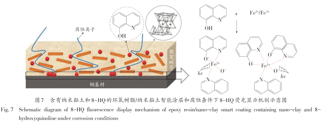 目前,在中介智能响应领域的智能涂层整体开发处于起步阶段,大部分只停留在智能预警、智能传感等方向,在这方面的研究成果颇多。张帅等系统分析了国内外阻燃智能预警涂层最新研究成果,包括阻燃预警响应机制、阻燃预警涂层新材料、阻燃预警智能涂层构筑策略及发展和应用前景。Mohammadloo 等研究了在含8-羟基喹啉(8-HQ)环氧涂层中加入纳米黏土对涂层早期腐蚀检测、电化学和光学性能的影响。荧光显微镜观察显示阳极区域腐蚀产生Fe2+/Fe3+离子后,8-HQ 通过金属阳离子刺激响应发生化学反应产生荧光斑点,将经Ti-Ni转化膜处理后的钢基材的早期腐蚀显示出来,如图7所示。Fan等通过溶剂热合成法制备了锆基金属有机框架-罗丹明B 的双发射荧光复合物(Zr-MOF@RhB),并将Zr-MOF@RhB 添加到环氧树脂中制备出具有快速响应和对Al3+高选择性的具有优异荧光性能的智能传感涂层,该涂层能够自主检测和识别表面涂层的损伤和基材铝的腐蚀。当出现橙黄色荧光时,表明只有涂层损坏而金属腐蚀未发生,当荧光颜色从橙黄色变为绿色时,涂层失效,基材开始腐蚀。在pH、温度波动较大及其他复杂外部条件下,该涂层能够长期有效地预警指示涂层损坏情况和识别铝腐蚀干扰物质。更重要的是,该双发射荧光复合物MOFs对各种金属离子具有荧光响应能力,可制备基于MOFs 的多功能智能传感自主报警-预防涂料。这种依赖于荧光MOFs简单而强大的预警系统不仅可以扩展MOFs的应用领域,而且是智能涂层发展的一个很有前途的方向。
