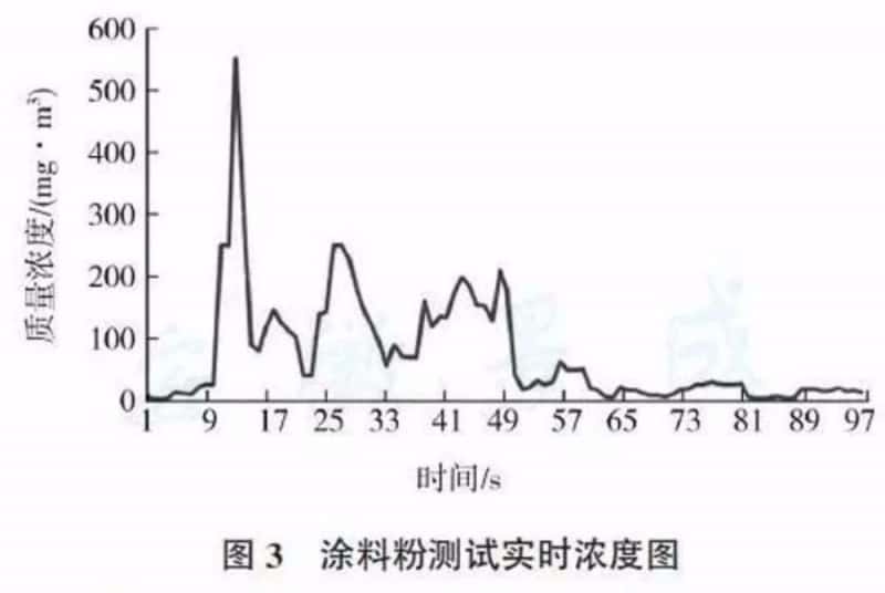 上述涂料大多数闪点较低,属于甲类或乙类危险化学品,风险较大,其化学特性见表1。本课题组通过最小点火能测试系统对某涂料粉进行最小点火能量测试,其装置结构如图2所示,测试中的实时浓度如图3所示,其测试位置为Hartmann管上侧口,最大质量浓度为550mg/m3,测试的部分结果如表2,可以看出其最小点火能(MIE)在53.4~91.7mJ之间,属于典型的可燃粉末,同时根据《我国工贸行业重点可燃性粉尘目录(2015版)》所述,目前静电粉末涂料的最小点火能量可达3.5mJ,具有极高的火灾爆炸可能性。