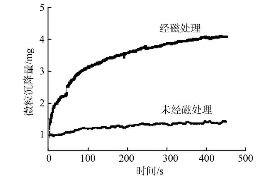 Zeta电位指水中带电粒子表面剪切层的电位。垢离子在水中形成固体小颗粒时,这些胶体状微粒之间存在静电相互作用,可用Zeta电位表征该胶体的稳定性,Zeta电位绝对值越大,胶体稳定性越好,微粒越不容易聚沉。研究发现,在磁场作用下碳酸钙溶液的Zeta电位绝对值减小,而溶液中Ca2+含量是决定Zeta电位变化的重要因素。电磁处理导致碳酸钙微粒Zeta电位绝对值减小,加速水溶液中碳酸钙微粒沉降,如图1所示,这可能是磁场促进了碳酸钙的成核过程或成核速率,使碳酸钙的沉积量增大。