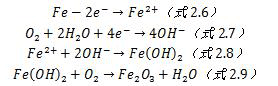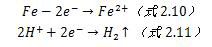 金属材料与酸接触,发生腐蚀析出氢气,也是析氢腐蚀。水中含有盐酸,或者游离的二氧化碳溶解导致水中pH低于7,都有可能产生析氢腐蚀。析氢腐蚀是一种电化学腐蚀,常发生于给水系统和凝结水系统,在省煤器中也有可能出现该类腐蚀,其反应如下: