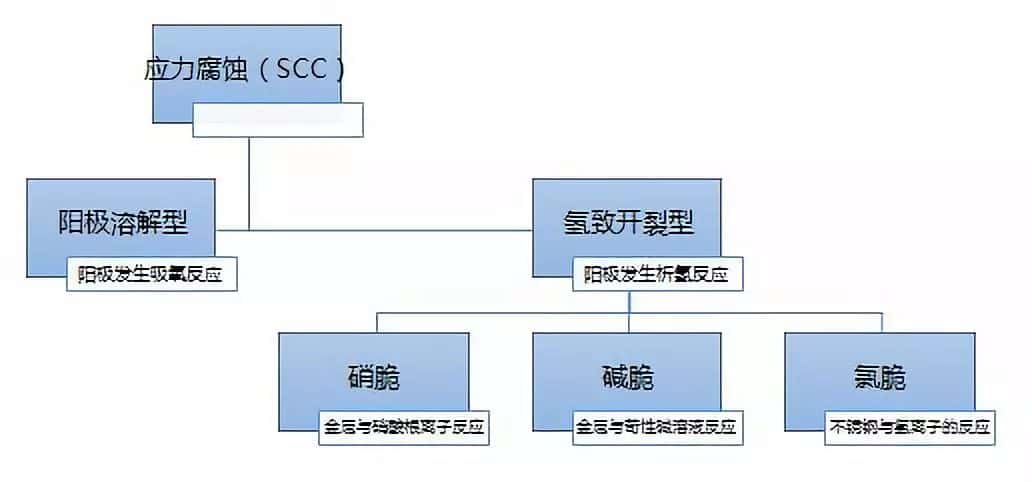 金属部件在特定的应力条件下,与各种腐蚀共同作用,导致部件在低于其强度极限的条件下脆性断裂的现象,称为应力腐蚀(SCC)。由于腐蚀形式的不同,应力腐蚀又可分为阳极溶解型应力腐蚀和氢致开裂型应力腐蚀,前者是部件在应力条件下产生氧腐蚀导致的应力腐蚀,后者是部件在特定应力条件下产生析氢反应所导致的应力腐蚀。氢致开裂型应力腐蚀又可细分为硝脆、碱脆、氯脆等。应力腐蚀在各个部位都有可能发生,特别是焊缝处或异径突变处。具体分类参照下图: