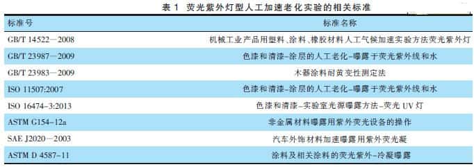 荧光紫外灯型人工加速老化实验的相关标准见表1。