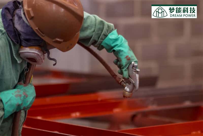 (1)涂料的施工粘度 涂料的粘度与施工环境温度有直接的关系,施工时必须按常温(25℃)时的粘度要求预以控制,这样既节省稀释剂又可保证喷涂质量。若涂料粘度过大,喷出来的漆雾呈颗粒状的点滴,使涂层表面呈桔皮状。若涂料粘度过小,喷涂后易发生流淌或涂层过薄,还会出现涂膜光泽不良等现象。因此,当喷涂施工温度低于10℃时,则应将涂料或施工现场提高至常温,将涂料控制在25℃时的要求粘度。温度在15℃以下时,每一道涂层厚度便会增加20μm左右。