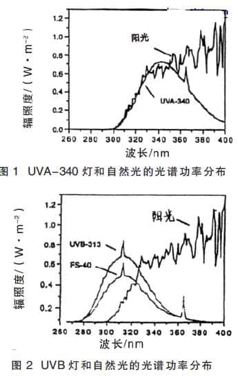 荧光紫外灯型老化机的光源主要是模拟自然光中的紫外波段,并通过对光强、温度、喷淋、凝露等因素进行控制来进行加速老化实验。常见的荧光紫外灯有UVA(UVA-340、UVA-351)和UVB(UVB-313、F40)2种。其光谱与自然光的对比见图1、图2。
