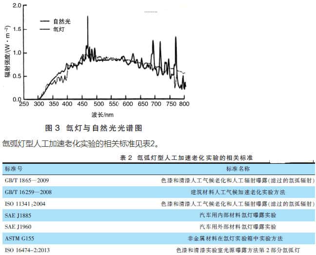 从图3 可以发现,氙灯发出的光谱与自然光的光谱非常接近,特别是在紫外部分和可见光部分,所以氙弧灯老化实验可以更好的模拟自然光来考查涂层在户外的耐久性,目前许多涂料产品标准采用氙灯老化机进行人工加速老化实验。